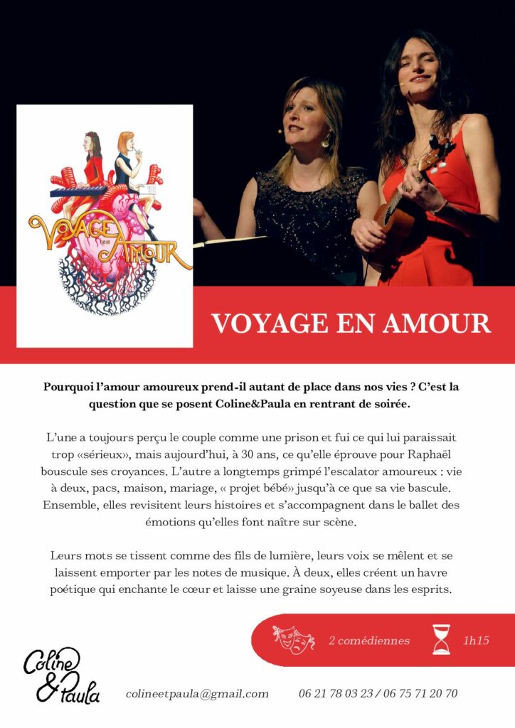 Pitch : Pourquoi l’amour amoureux prend-il autant de place dans nos vies ? C’est la question que se posent Coline&Paula en rentrant de soirée. L’une a toujours perçu le couple comme une prison et fui ce qui lui paraissait trop «sérieux», mais aujourd’hui, à 30 ans, ce qu’elle éprouve pour Raphaël bouscule ses croyances. L’autre a longtemps grimpé l’escalator amoureux : vie à deux, pacs, maison, mariage, « projet bébé» jusqu’à ce que sa vie bascule. Ensemble, elles revisitent leurs histoires et s’accompagnent dans le ballet des émotions qu’elles font naître sur scène. Leurs mots se tissent comme des fils de lumière, leurs voix se mêlent et se laissent emporter par les notes de musique. À deux, elles créent un havre poétique qui enchante le cœur et laisse une graine soyeuse dans les esprits.
